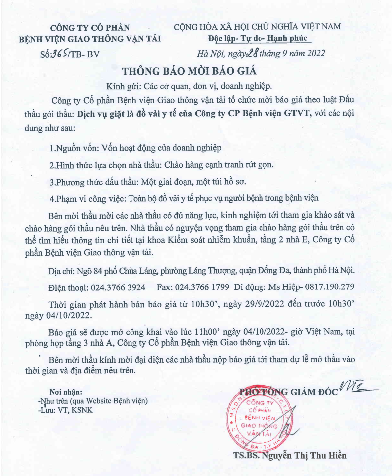 THÔNG BÁO MỜI BÁO GIÁ DỊCH VỤ GIẶT LÀ ĐỒ VẢI Y TẾ14:46 - 28/09/2022Thông tin, Đấu thầu, Thông tin chung, Dịch vụ giặt là đồ vải y tế của Công ty CP Bệnh viện GTVT. File Thông báo mời báo giá đính kèm: Tải xuống thông báo mời báo giá dịch vụ giặt là đồ vải y tế của công ty cp bệnh viện gtvt.pdfChia sẻ: