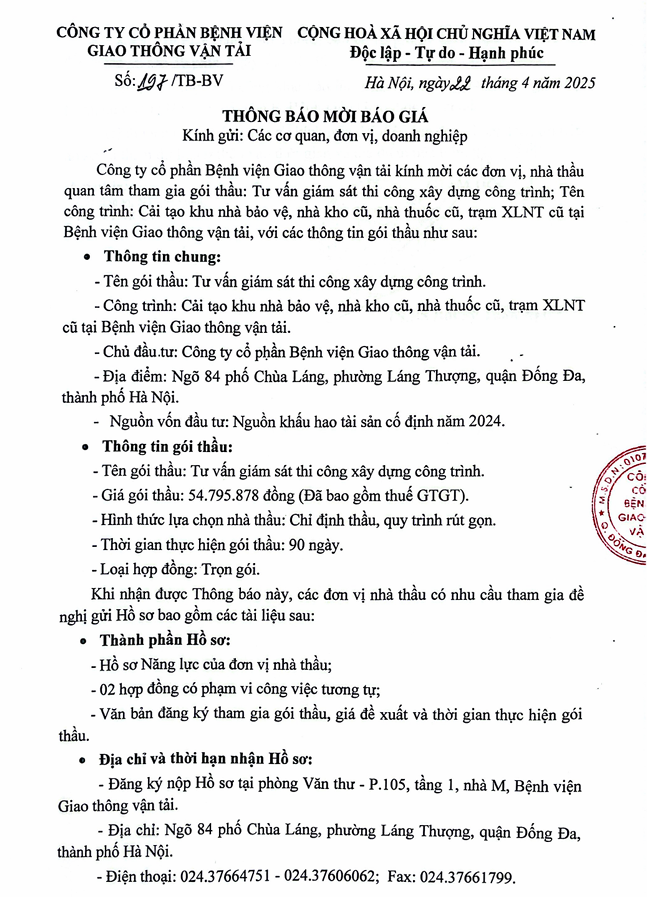 Thông báo mời báo giá gói thầu: Cải tạo khu nhà bảo vệ, nhà kho cũ, nhà thuốc cũ và trạm XLNT cũ08:38 - 23/04/2025Yêu cầu báo giá, Đấu thầu, Thông tin chung, Tải xuống goi thầu tư vấn giám sát nhà thuốc cũ.pdfChia sẻ:
