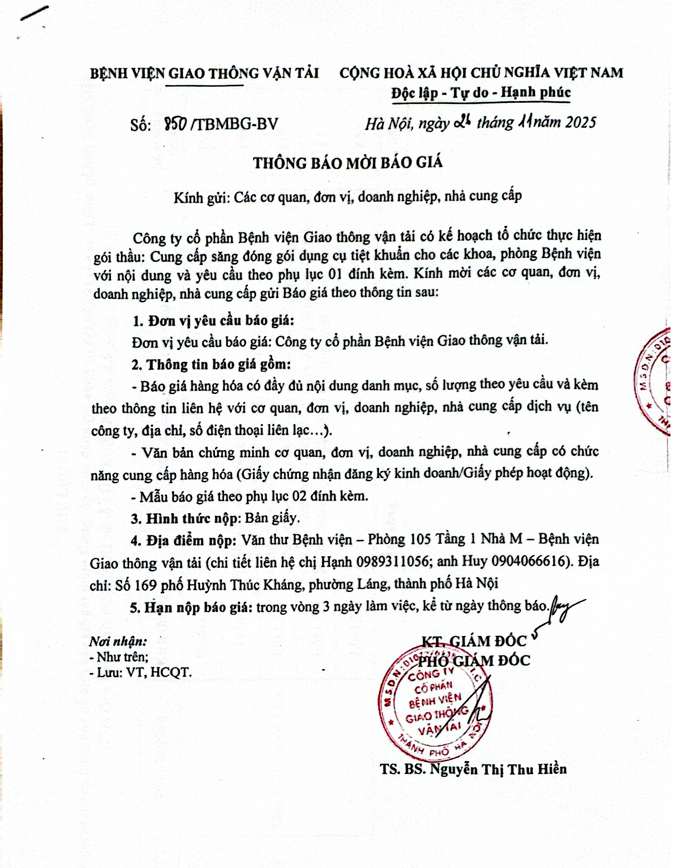 Thông báo mời báo giá gói thầu: "Cung cấp săng đóng gói dụng cụ tiệt khuẩn cho các khoa, phòng Bệnh viện"10:51 - 27/11/2025Thông tin, Yêu cầu báo giá, Đấu thầu, Tải xuống 1- thông báo mời báo giá cung cấp săng đóng gói dụng cụ bvgtvt.pdfChia sẻ: