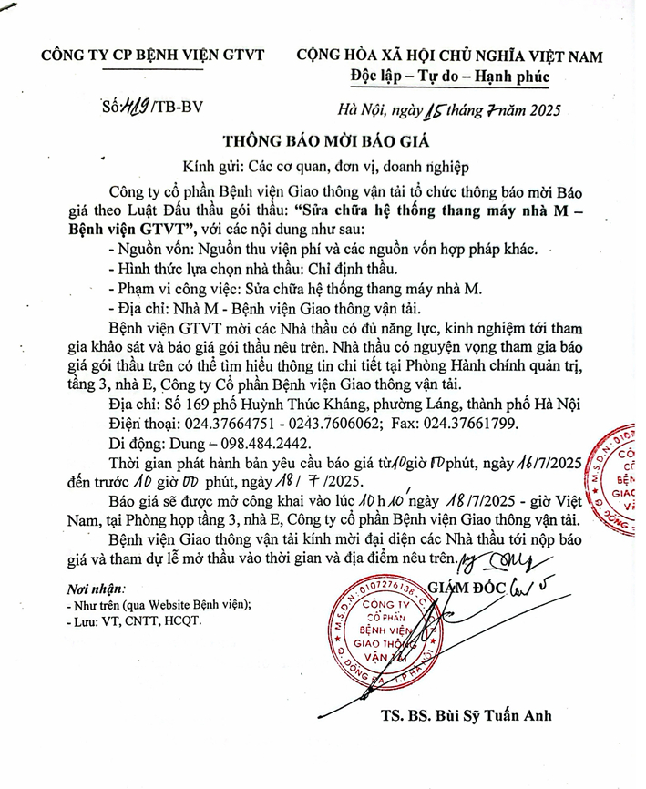 Thông báo mời báo giá gói thầu: Sửa chữa hệ thống thang máy nhà M - Bệnh viện GTVT10:21 - 15/07/2025Thông tin, Yêu cầu báo giá, Thông tin chung, Tải xuống 6- TB mời báo giá sửa chữa thang máy nhà M.pdfChia sẻ: