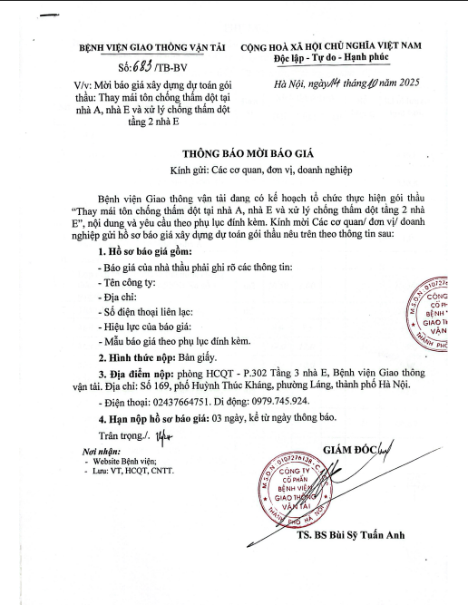 Thông báo mời báo giá gói thầu "Thay mái tôn chống thấm dột tại nhà A, nhà E và xử lý chống thấm dột tầng 2 nhà E"15:49 - 14/10/2025Yêu cầu báo giá, Đấu thầu, Thông tin chung, Bệnh viện Giao thông vận tải đang có kế hoạch tổ chức thực hiện gói thầu “Thay mái tôn chống thấm dột tại nhà A, nhà E và xử lý chống thấm dột tầng 2 nhà E" Tải xuống tb mời báo giá xây dựng dự toán gói thầu.pdfChia sẻ: