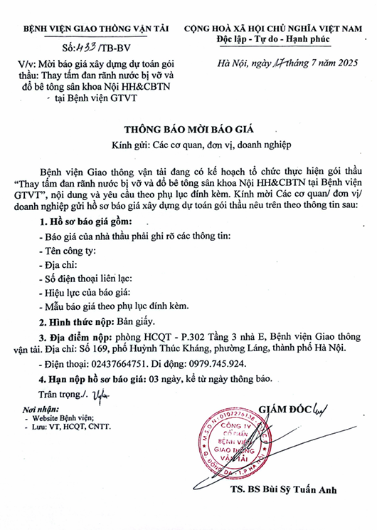 Thông báo mời báo giá gói thầu: Thay tấm đan rãnh nước bị vỡ và đổ bê tông sân khoa Nội HH&CBTN tại Bệnh viện GTVT12:32 - 17/07/2025Thông tin, Yêu cầu báo giá, Thông tin chung, Tải xuống mời báo giá xây dựng dự toán gói thay tấ.pdfChia sẻ: