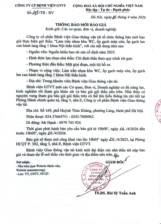 THÔNG BÁO MỜI BÁO GIÁ “Làm trần nhựa khu WC, ốp gạch mép cửa, ốp gạch lan can hành lang tẩng 1 khoa Nội thần kinh”15:31 - 16/04/2026Thông tin chung, Đấu thầu, Yêu cầu báo giá, Công ty cổ phần Bệnh viện Giao thông vận tải tổ chức thông báo mời báo giá thực hiện gói thẩu: “Làm trần nhựa khu WC, ốp gạch mép cửa, ốp gạch lan can hành lang tẩng 1 khoa Nội thần kinh”, với các nội dung như sau Tải xuống TB-moi-thi-cong-goi-thau-t1ntk.pdfChia sẻ: