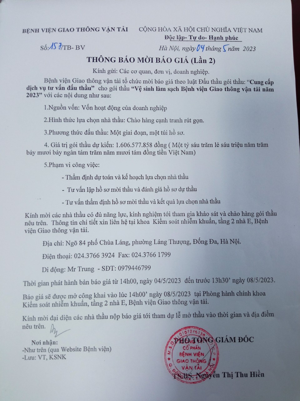 Bệnh viện Giao thông vận tải tổ chức mời báo giá theo luật Đấu thầu gói thầu: "Cung cấp dịch vụ tư vấn đấu thầu" cho gói thầu "Vệ sinh làm sạch Bệnh viện Giao thông vận tải năm 2023".