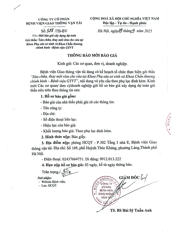Thông báo mời báo giá Sửa chữa thay mới rèm che cửa tại Khoa Phụ sản sơ sinh và Khoa Chấn thương chỉnh hình08:33 - 09/09/2025Yêu cầu báo giá, Đấu thầu, Thông tin chung, Bệnh viện Giao thông vận tải đang có kế hoạch tổ chức thực hiện gói thầu "Sửa chữa, thay mới rèm che cửa tại Khoa phụ sản sơ sinh và Khoa Chấn thương chỉnh hình - Bệnh viện GTVT", nội dung và yêu cầu trong phụ lục đính kèm Tải xuống tb mời báo giá rèm cửa.pdfChia sẻ: