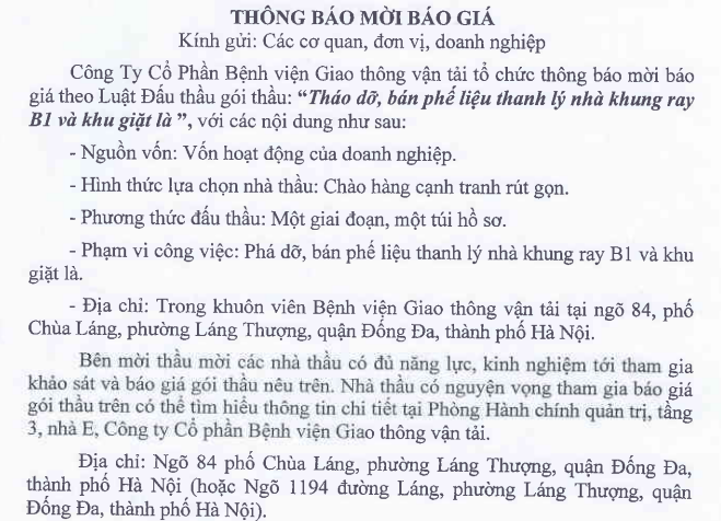 Thông báo mời báo giá: Tháo dỡ, bán phế liệu thanh lý nhà khung ray B1 và khu giặt là08:31 - 22/12/2023Đấu thầu, Yêu cầu báo giá, Tải xuống 202312261020.pdfChia sẻ:
