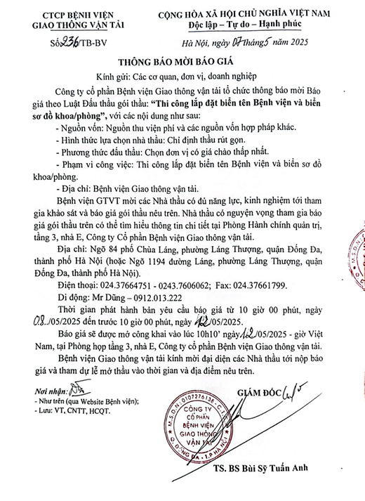 Thông báo mời báo giá theo Luật đấu thầu gói thầu: "Thi công lắp đặt biển tên Bệnh viện và biển sơ đồ Khoa/phòng"16:20 - 07/05/2025Yêu cầu báo giá, Đấu thầu, Thông tin chung, Tải xuống Thông báo mời báo giá Thi công lắp đặt biển tên Bệnh viện và biển sơ đồ Khoa phòng.pdfChia sẻ: