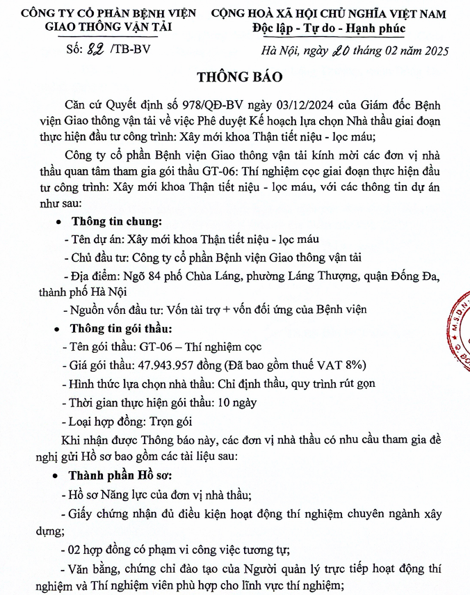 Thông báo mời tham gia gói thầu GT-06: Thí nghiệm cọc giai đoạn thực hiện đầu tư công trình: Xây mới khoa Thận tiết niệu - lọc máu09:23 - 21/02/2025Đấu thầu, Yêu cầu báo giá, Tải xuống thông báo mời tham gia gói thầu gt-06 tn.pdfChia sẻ:
