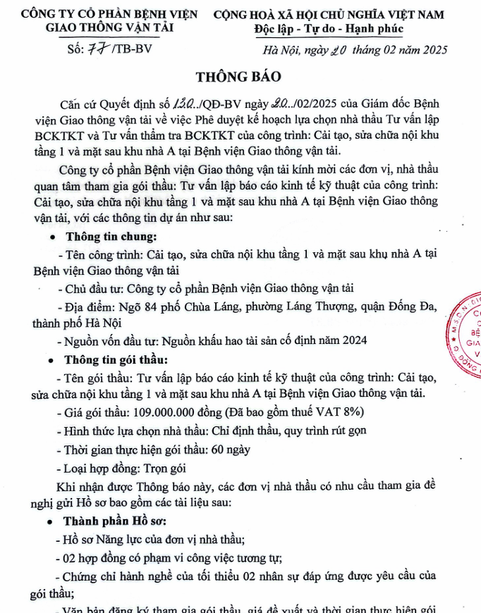 Thông báo mời tham gia gói thầu: Tư vấn lập báo cáo kinh tế kỹ thuật của công trình: Cải tạo, sửa chữa nội khu tầng 1 và mặt sau khu nhà A tại Bệnh viện09:37 - 21/02/2025Yêu cầu báo giá, Đấu thầu, Tải xuống tư vấn lập báo cáo kinh tế kỹ thuật của công trình cải tạo, sửa chữa nội khu tầng 1 và mặt sau khu nhà a tại bệnh viện.pdfChia sẻ: