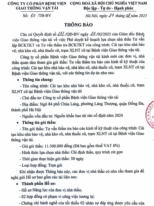 Thông báo mời tham gia gói thầu: Tư vấn thẩm tra báo cáo kinh tế kỹ thuật của công trình: Cải tạo khu nhà bảo vệ, nhà kho cũ, nhà thuốc cũ, trạm XLNT cũ tại Bệnh viện09:33 - 21/02/2025Yêu cầu báo giá, Đấu thầu, Tải xuống tư vấn thẩm tra báo cáo kinh tế kỹ thuật của công trình cải tạo khu nhà bảo vệ, nhà kho cũ, nhà thuốc cũ, trạm xlnt cũ tại bệnh viện.pdfChia sẻ: