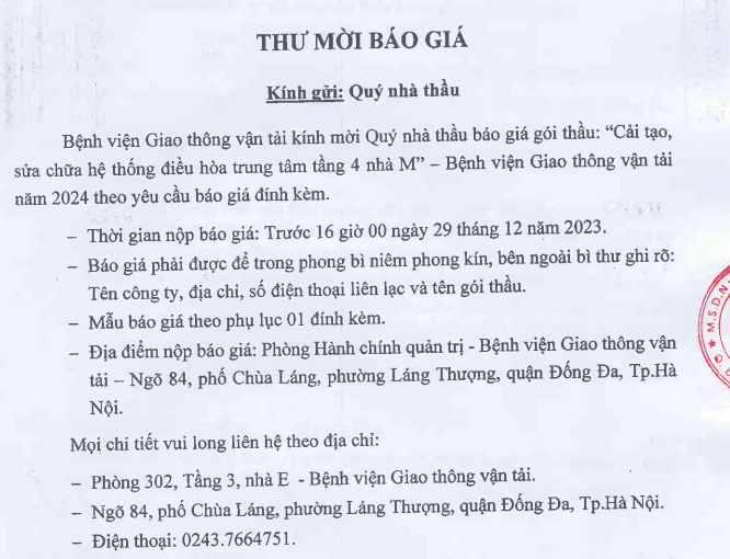 Thông báo mời thầu: Cải tạo, sửa chữa hệ thống điều hòa trung tâm tầng 4 nhà M08:57 - 22/12/2023Đấu thầu, Yêu cầu báo giá, Tải xuống thư mời báo giá cải tạo điều hòa.pdfChia sẻ: