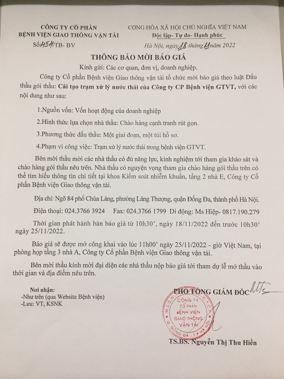 Thông báo mời thầu: Gói cải tạo trạm xử lý nước thải của Công ty CP Bệnh viện GTVT11:02 - 18/11/2022Thông tin, Đấu thầu, Thông tin chung, Bên mời thầu mời các nhà thầu có đủ năng lực, kinh nghiệm tới tham gia khảo sát và chào hàng gói thầu trên.Chia sẻ: