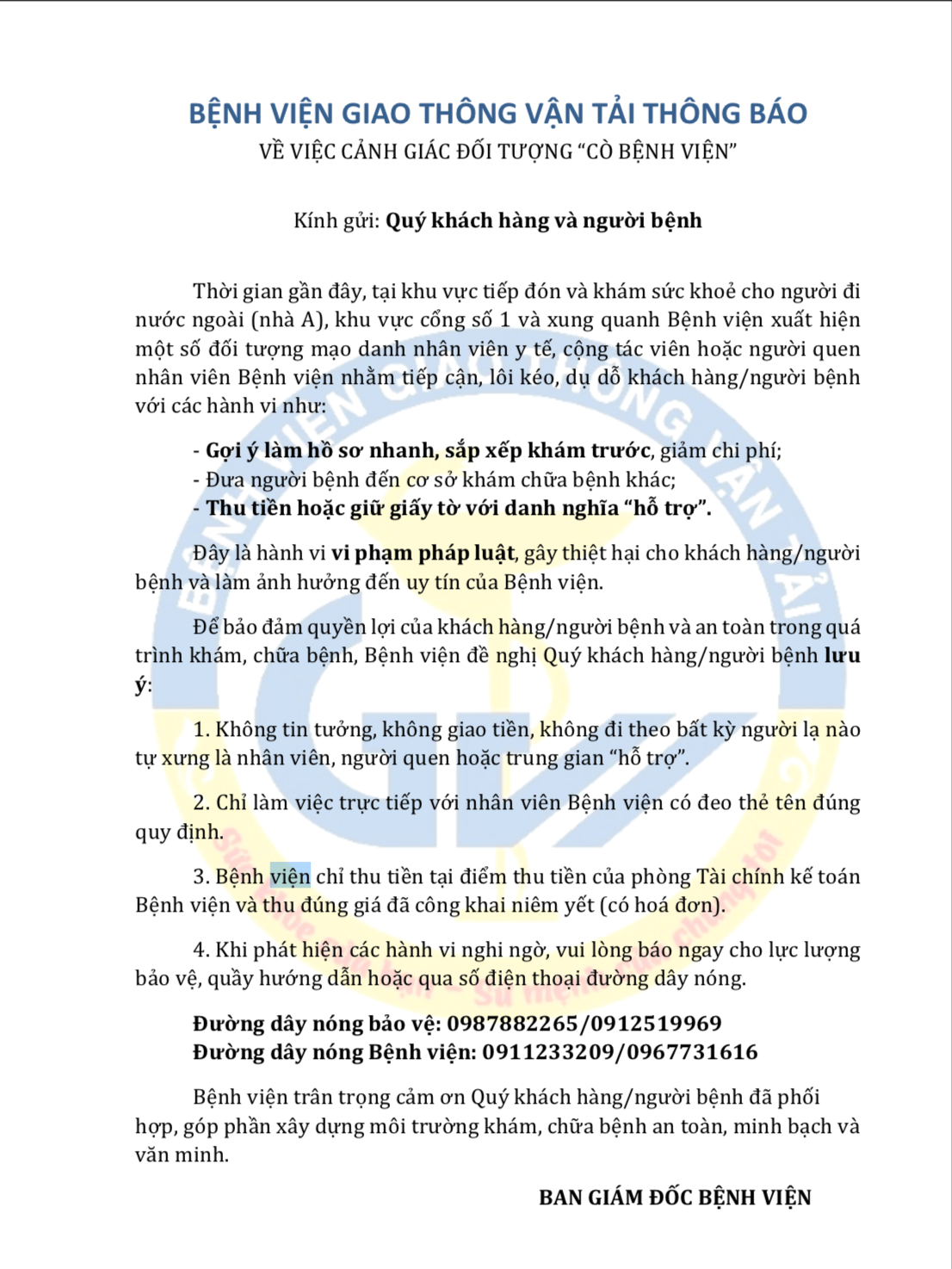 THÔNG BÁO VỀ VIỆC CẢNH GIÁC ĐỐI TƯỢNG “CÒ BỆNH VIỆN”