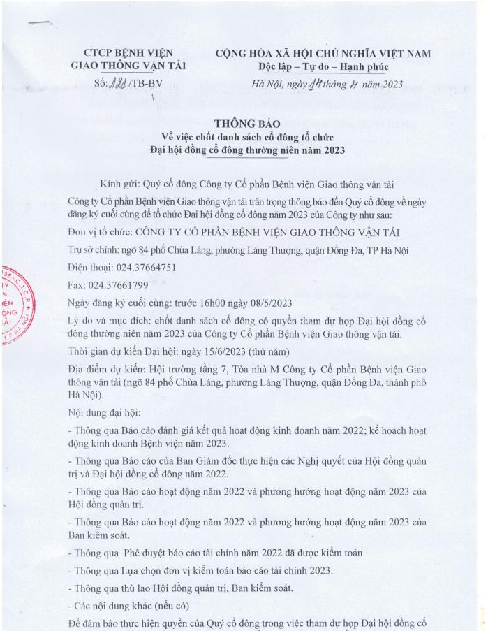 THÔNG BÁO VỀ VIỆC CHỐT DANH SÁCH CỔ ĐÔNG TỔ CHỨC ĐẠI HỘI ĐỒNG CỔ ĐÔNG THƯỜNG NIÊN NĂM 202312:22 - 14/04/2023Thông tin chung, Thông tin, File Thông báo đính kèm: Tải xuống thông báo vv chốt ds tổ chức đhđcđ 2023.pdfChia sẻ: