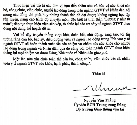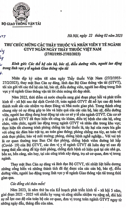 Thư chúc mừng các thầy thuốc và nhân viên y tế ngành GTVT nhân ngày Thầy thuốc Việt nam (27/02/1955 - 27/02/2023)17:55 - 27/02/2023Thông tin, Thông tin chung, Chia sẻ: