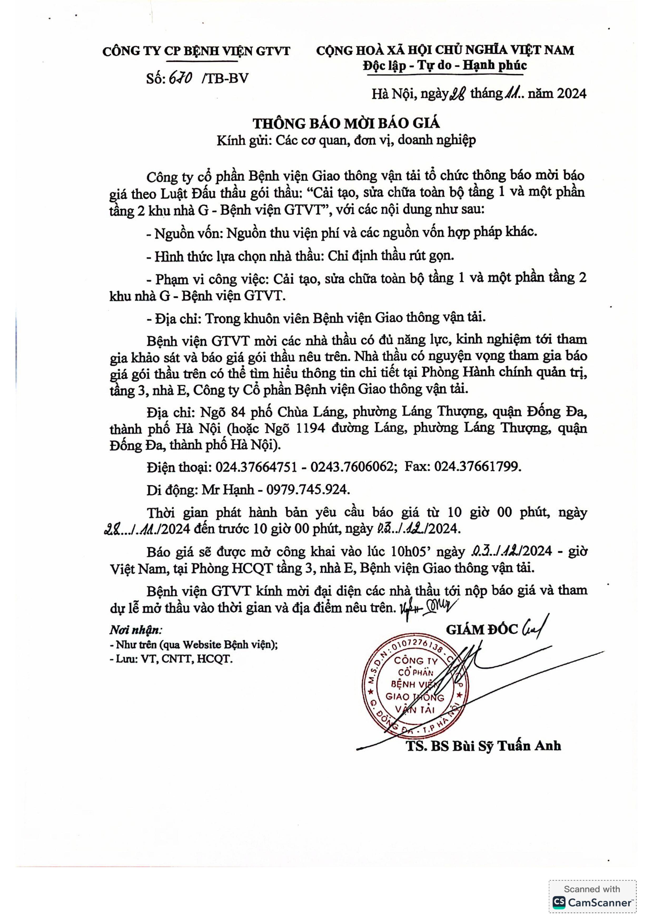 Thư mời báo giá: Cải tạo, sửa chữa toàn bộ tầng 1 và một phần tầng 2 nhà G - Bệnh viện GTVT15:48 - 28/11/2024Thông tin đấu thầu, Phòng Hành Chính - Quản Trị, Yêu cầu báo giá, Chia sẻ: