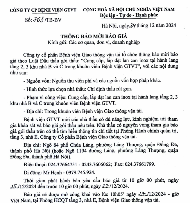 Thư mời báo giá gói thấu: Cung cấp, lắp đặt lan can inox tại hành lang tầng 2, 3 khu nhà B và C trong khuôn viên Bệnh viện10:28 - 25/12/2024Yêu cầu báo giá, Phòng Hành Chính - Quản Trị, Tải xuống cung cấp, lắp đặt lan can inox tại hành lang tâng 2, 3 khu nhà b và c trong khuôn viên bệnh viện.pdfChia sẻ:
