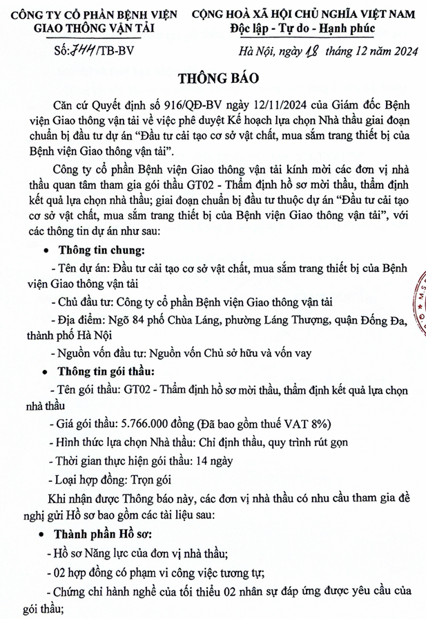 Thư mời báo giá gói thầu GT02 - Thẩm định hồ sơ mời thầu, thẩm định kết quả lựa chọn nhà thầu; giai đoạn chuẩn bị đầu tư thuộc dự án "Đầu tư cải tạo cơ sở vật chất, mua sắm trang thiết bị của Bệnh viện Giao thông vận tải"22:04 - 19/12/2024Đấu thầu, Yêu cầu báo giá, Phòng Hành Chính - Quản Trị, Tải xuống cải tạo csvt - mua sắm trang thiết bị (gói gt02).pdfChia sẻ: