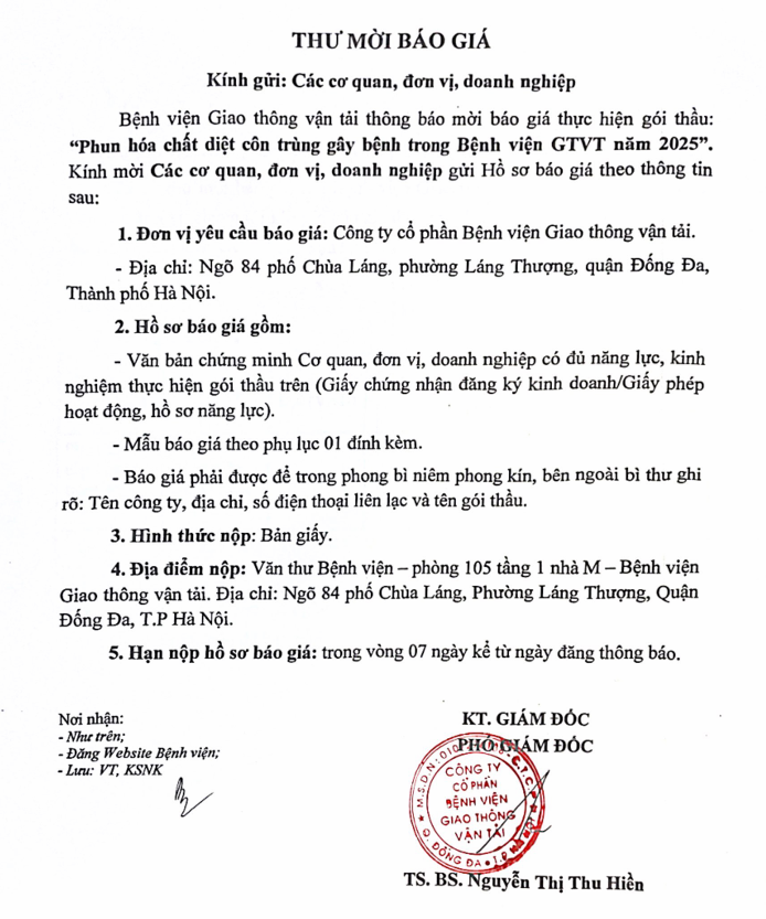 Thư mời báo giá gói thầu: Phun hóa chất diệt côn trùng gây bệnh trong bệnh viện năm 202515:15 - 14/01/2025Yêu cầu báo giá, Tải xuống thư mời báo giá muỗi 2025.pdfChia sẻ:
