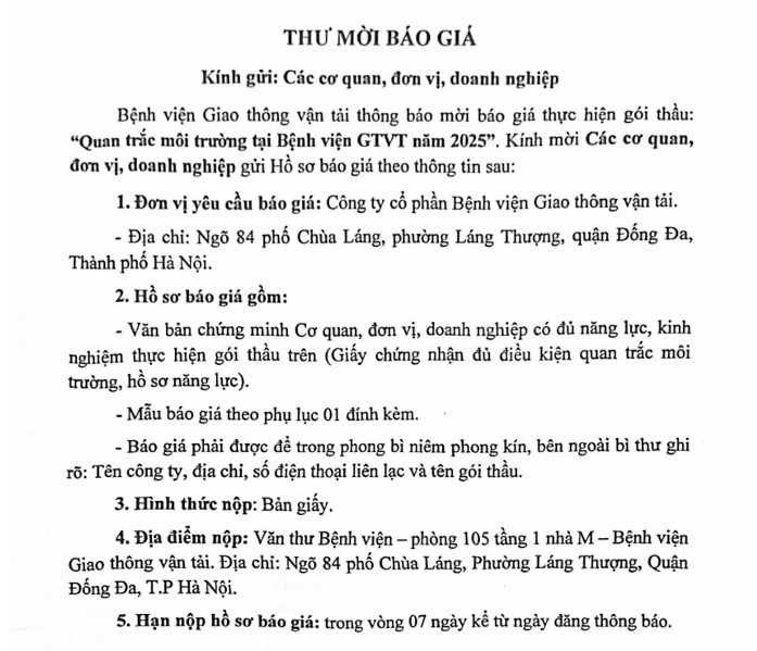 Thư mời báo giá gói thầu: Quan trắc môi trường tại Bệnh viện năm 202515:21 - 14/01/2025Yêu cầu báo giá, Tải xuống thư mời báo giá quan trắc mt 2025.pdfChia sẻ:
