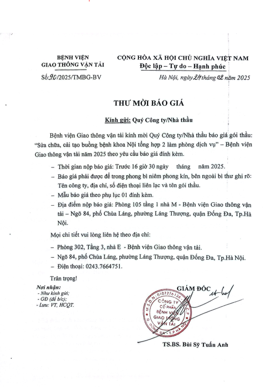 Thư mời báo giá gói thầu: Sửa chữa, cải tạo buồng bệnh khoa Nội tổng hợp 2 làm phòng dịch vụ15:55 - 24/02/2025Đấu thầu, Yêu cầu báo giá, Tải xuống Thư mời báo giá khoa Nội tổng hợp 2.pdfChia sẻ: