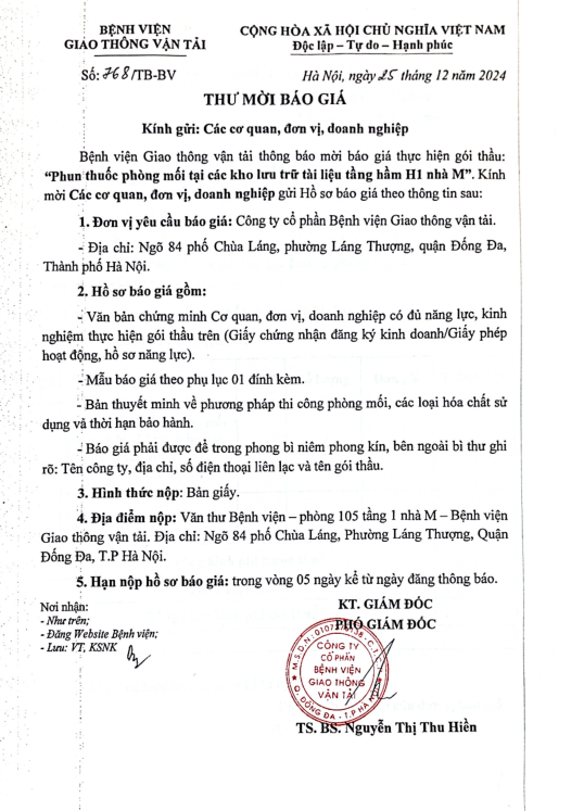 Thư mời báo giá: Phun thuốc mối tại các kho lưu trữ tài liệu tầng hầm 1 nhà M13:04 - 25/12/2024Thông tin, Yêu cầu báo giá, Đấu thầu, Thông tin chung, Tải xuống thư mời báo giá mối h1.pdfChia sẻ: