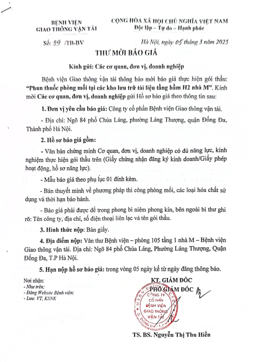 Thư mời báo giá: Phun thuốc phòng mối tại các kho lưu trữ tài liệu hầm H2 nhà M năm 202518:26 - 12/03/2025Thông tin, Yêu cầu báo giá, Đấu thầu, Thông tin chung, Tải xuống thư mời báo giá mối h2.pdfChia sẻ: