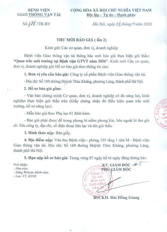 THƯ MỜI BÁO GIÁ "Quan trắc môi trường tại Bệnh viện GTVT năm 2026” lần 215:33 - 06/04/2026Yêu cầu báo giá, Đấu thầu, Thông tin chung, Bệnh viện Giao thông vận tải thông báo mời báo giá thực hiện gói thầu: "Quan trắc môi trường tại Bệnh viện GTVT năm 2026”. Kính mời Các cơ quan, đơn vị, doanh nghiệp gửi Hồ sơ báo giá theo thông tin sau: Tải xuống tb mời báo giá gói quan trắc mt 2026 lần 2.pdfChia sẻ:
