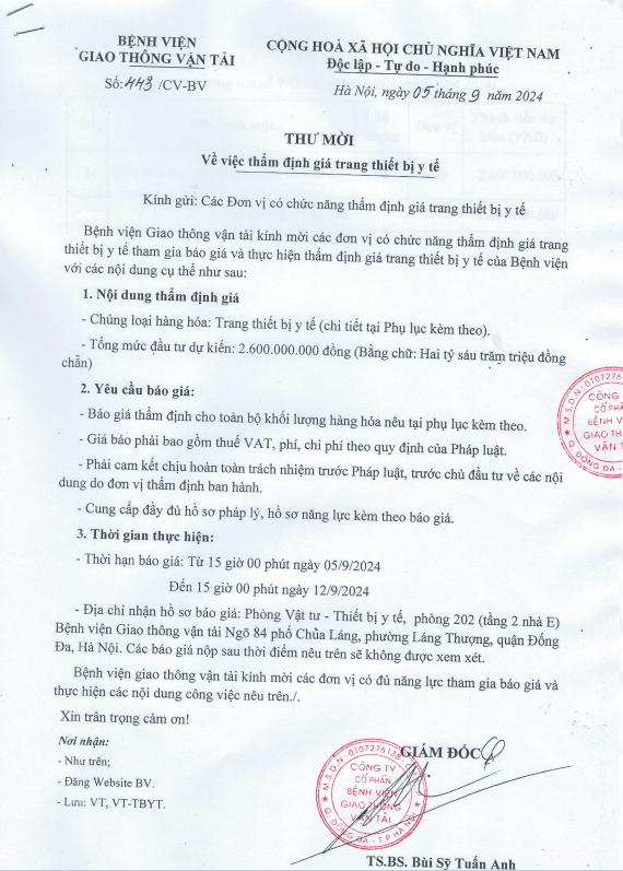 Thư mời báo giá: thẩm định giá trang thiết bị y tế14:19 - 06/09/2024Yêu cầu báo giá, Thông tin chung, thẩm định giá trang thiết bị y tế Tải xuống mời thẩm định giá trang thiết bị y tế.pdfChia sẻ: