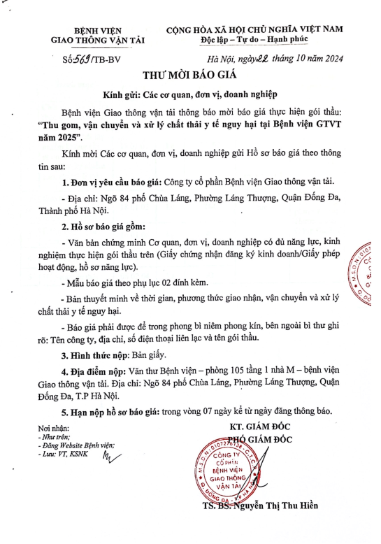Thư mời báo giá: :Thu gom, vận chuyển và xử lý chất thải y tế nguy hại tại Bệnh viện GTVT năm 202513:41 - 22/10/2024Thông tin, Yêu cầu báo giá, Đấu thầu, Thông tin chung, Tải xuống thư mời báo giá ctnh 2025.pdfChia sẻ: