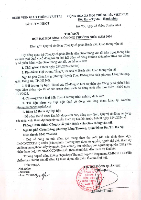 Thư Mời: Họp Đại hội đồng cổ đông thường niên năm 202409:55 - 01/04/2024Thông tin, Đấu thầu, Quan hệ cổ đông, Kính gửi: Quý vị cổ đông Công ty cổ phần Bệnh viện Giao thông vận tải Tải xuống Tai lieu hop DHDCD thuong nien nam 2024_signed.pdfChia sẻ: