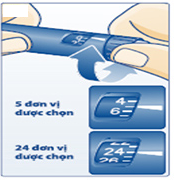 - Chọn liều cần dùng (trong ví dụ dưới đây liều được chọn là 5 đơn vị hoặc 24 đơn vị). Nếu lỡ vặn quá liều cần thiết, bệnh nhân có thể vặn ngược trở lại.