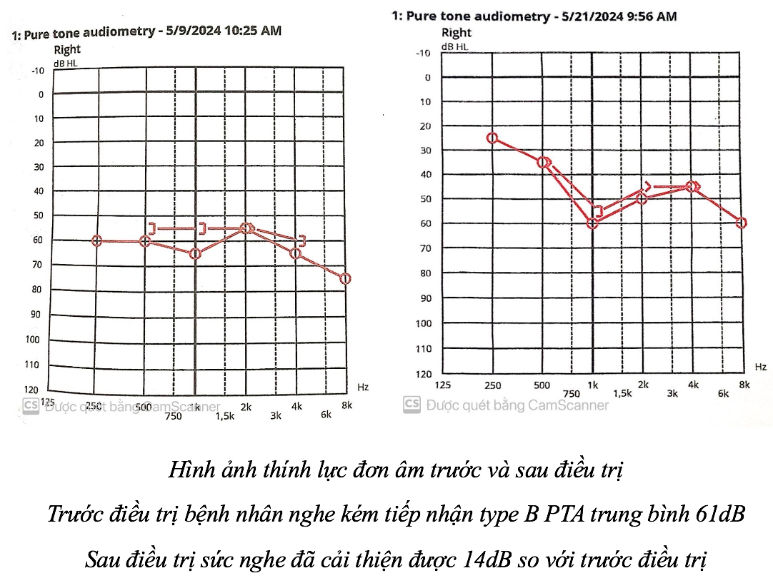 Bệnh nhân P.V.D sinh năm 1949 đến khám tại khoa Tai Mũi Họng Bệnh viện Giao thông vận tải trong tình trạng nghe kém 2 tai 7 ngày, ù tai tiếng cao, rất khó khăn trong việc giao tiếp, bệnh nhân mất ngủ do ù tai nhiều. Sau khi được khám tai mũi họng, đo thính lực đơn âm, bệnh nhân được chẩn đoán Điếc đột tai phải ngày thứ 7 nhập viện điều trị với nhiều yếu tố tiên lượng không đáp ứng điều trị : tuổi cao, nhiều bệnh lý nền, thời gian điều trị muộn,... Các bác sĩ khoa Tai Mũi Họng đã điều trị thuốc theo đúng phác đồ, kết hợp tiêm xuyên màng nhĩ corticosteroid, sau điều trị 12 ngày bệnh nhân được xuất viện đã hết ù tai, sức nghe tốt hơn.