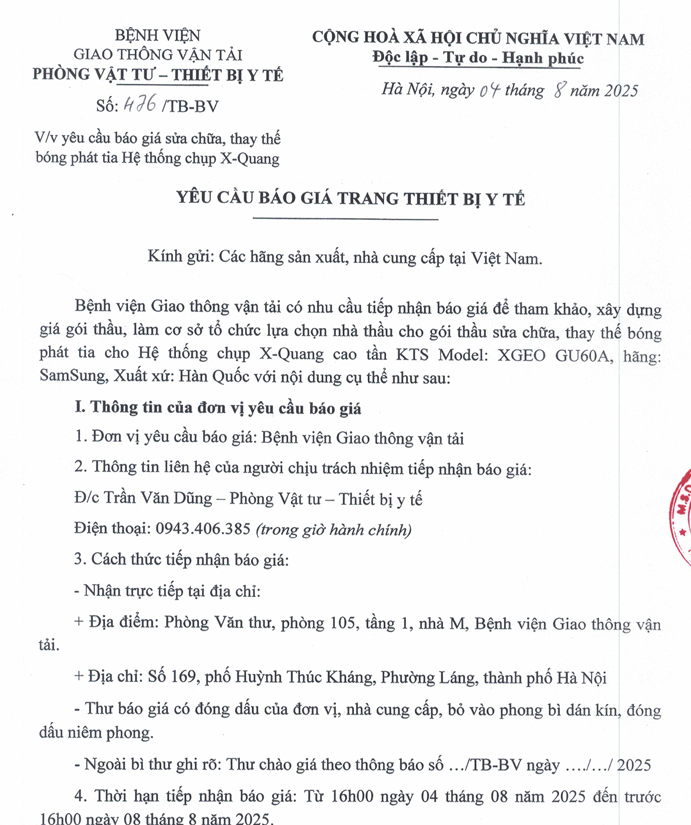 Bệnh viện Giao thông vận tải có nhu cầu tiếp nhận báo giá để tham khảo xây dựng giá gói thầu, làm cơ sở tổ chức lựa chọn nhà thầu cho gói thầu sửa chữa, thay thế bóng phát cho Hệ thống chụp X-quang cao tần KTS Model: XGEO GU60A, hãng SamSung, Xuất xứ: Hàn Quốc.