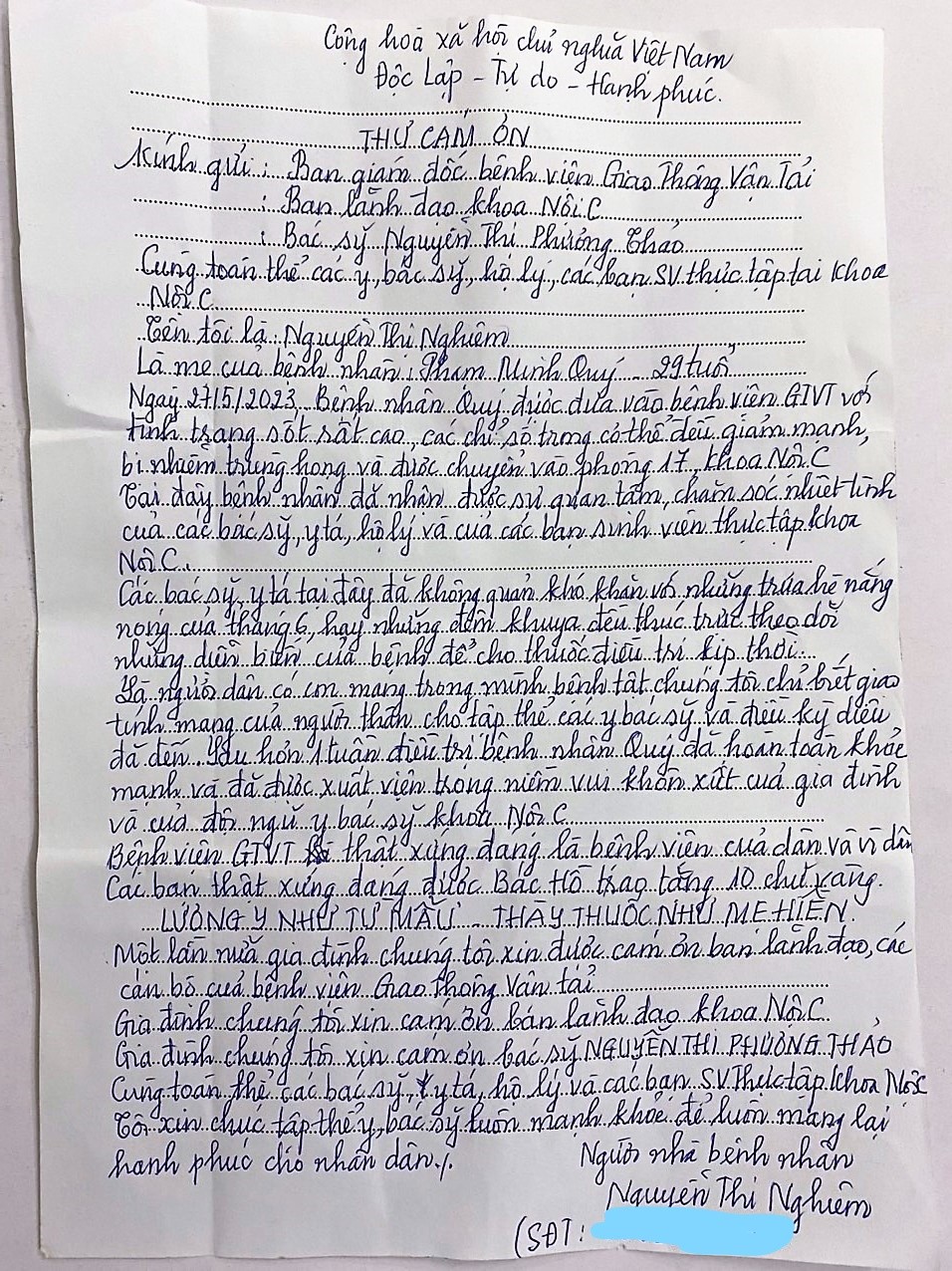 “Kính gửi Ban Giám đốc Bệnh viện Giao thông vận tải, Ban Lãnh đạo khoa Nội C, Bác sỹ Nguyễn Thị Phương Thảo cùng toàn thể các y, bác sỹ, hộ lý, các bạn sinh viên thực tập tại Khoa Nội C. Tên tôi là Nguyễn Thị Nghiêm, là mẹ của bệnh nhân Phạm Minh Quý 29 tuổi.