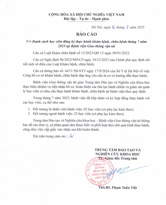 Bệnh viện Giao thông vận tải giao Trung tâm Đào tạo và Nghiên cứu khoa học thực hiện nhiệm vụ tiếp nhận hồ sơ, hoàn thiện các thủ tục hành chính và giám sát quản lý học viên có nhu cầu thực hành khám bệnh, chữa bệnh tại bệnh viện theo quy định. Trong tháng 7 năm 2025, bệnh viện đã tiếp nhận và ký hợp đồng thực hành với các học viên.