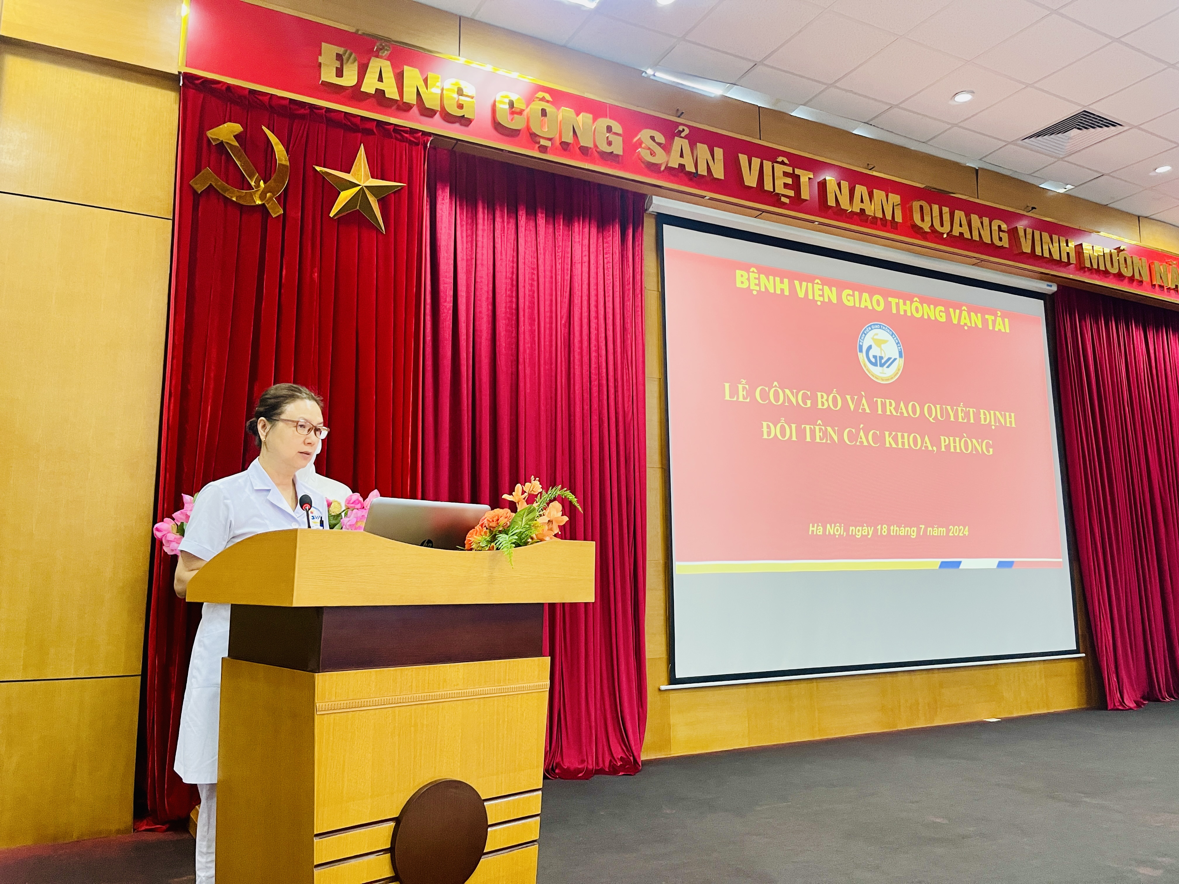 Tại buổi lễ, BSCKII. Nguyễn Thị Thu Hà - Trưởng phòng Tổ chức nhân sự đã công bố các quyết định số 478/QĐ-BV, 479/QĐ-BV, 480/QĐ-BV, 481/QĐ-BV ngày 16 tháng 07 năm 2024 về việc đổi tên khoa Nội A1 thành khoa Nội Tổng hợp 1, đổi tên khoa Nội A2 thành khoa Nội Tổng hợp 2, đổi tên khoa Nội C thành khoa Nội hô hấp và các bệnh truyền nhiễm, đổi tên phòng Kinh doanh và Marketing thành phòng Công tác xã hội.