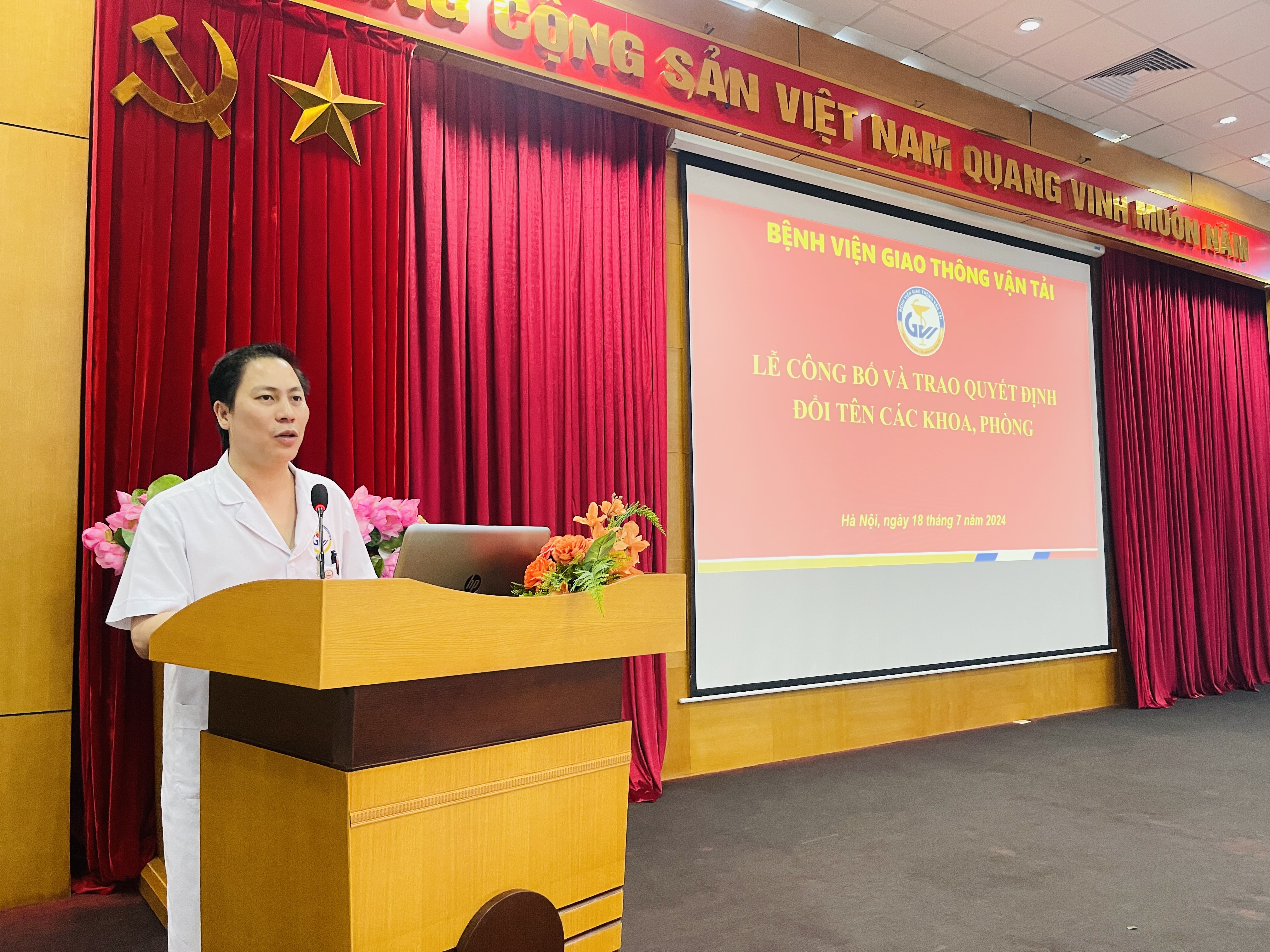 Phát biểu tại buổi lễ, TS. BS Bùi Sỹ Tuấn Anh - Bí thư Đảng ủy, Giám đốc Bệnh viện mong muốn với tên gọi mới, tất cả bác sĩ, điều dưỡng và cán bộ nhân viên, người lao động của các khoa/phòng cũng như toàn Bệnh viện tiếp tục rèn luyện, trau dồi chuyên môn và công tác quản lý để hoàn thành xuất sắc mọi nhiệm vụ được giao, đưa tập thể khoa/phòng phát triển, góp phần xây dựng Bệnh viện ngày càng tốt hơn, đáp ứng sự hài lòng của người bệnh, người dân.