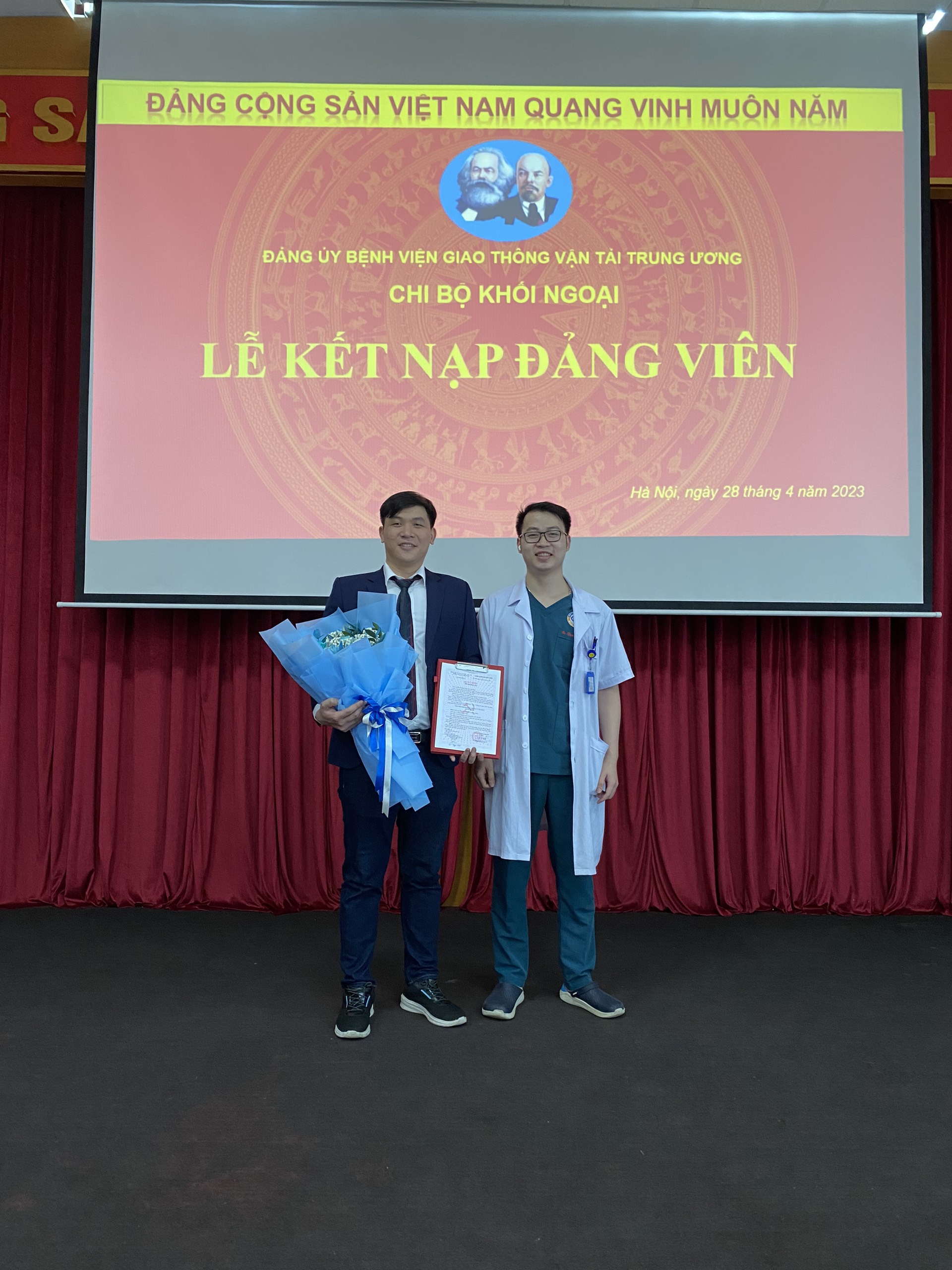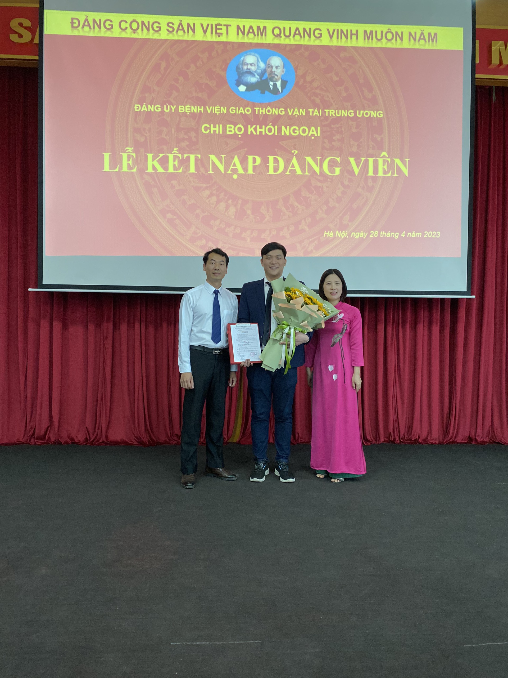 Thực hiện Quyết định số 89 QĐ/ĐUC ngày 05/4/2023 của Đảng ủy Cục Y tế GTVT về việc kết nạp đảng viên, được sự đồng ý của Đảng uỷ bệnh viện, ngày 28/4/2023 Chi bộ Khối Ngoại tổ chức Lễ kết nạp đảng viên cho ThS. Bs Nguyễn Vũ Minh Thiện – bác sỹ khoa Ngoại tổng hợp.