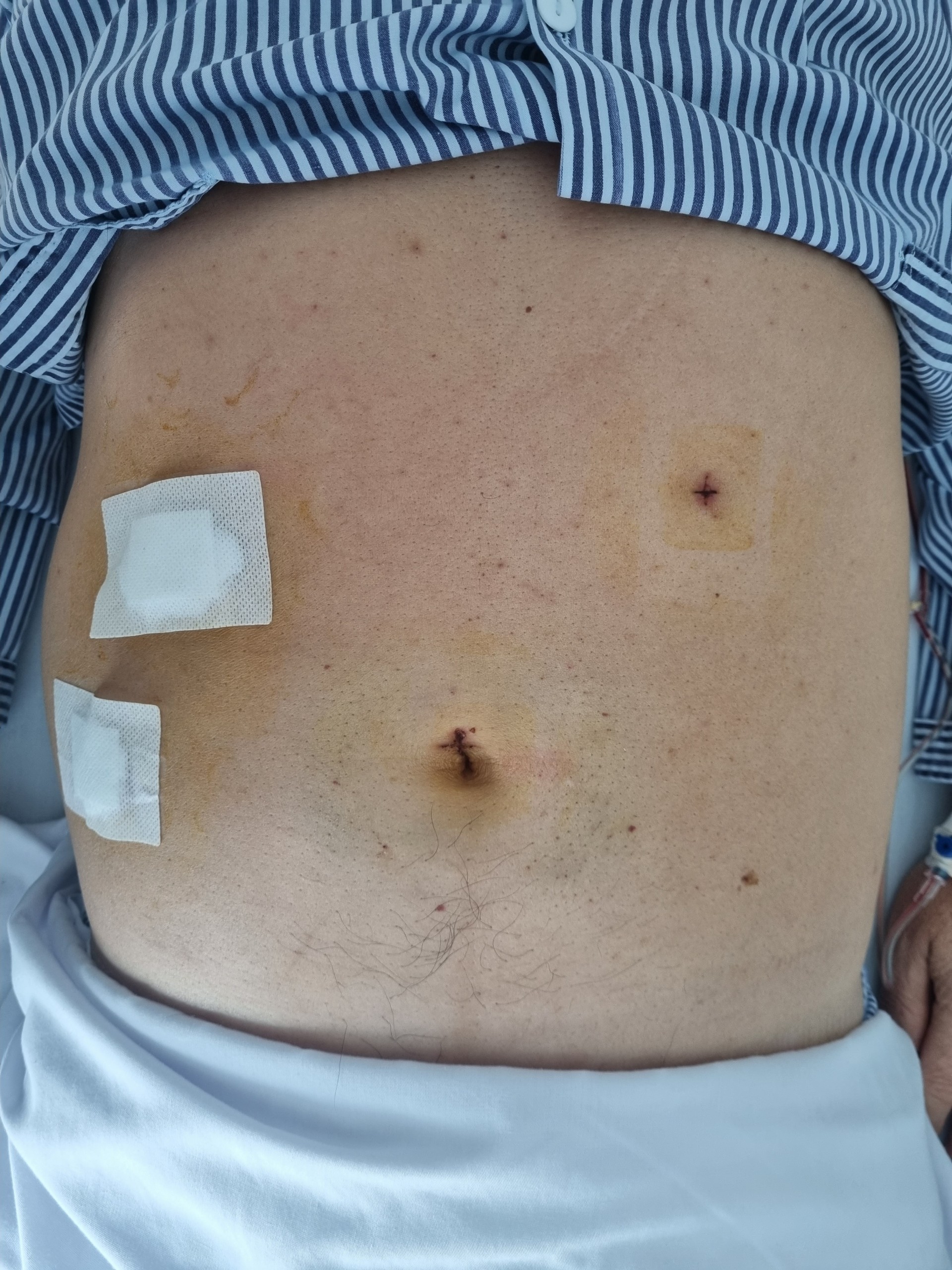 Bệnh nhân nam 60 tuổi vào viện vì đau bụng đột ngột dữ dội vùng thượng vị giờ thứ 4. Qua thăm khám và chụp phim, các bác sỹ xác định bệnh nhân bị viêm phúc mạc do thủng tạng rỗng, nghĩ nhiều đến thủng dạ dày. Đây là một bệnh nhân thể trạng béo (>90kg), có nhiều bệnh lý nền: tăng huyết áp, đái tháo đường, Gout mạn tính, thoát vị đĩa đệm đi lại khó khăn, thường xuyên tự sử dụng corticoid. Khi vào viện tình trạng bệnh nhân nặng, huyết áp cao 180/100mmHg, đường máu 23mmol/L, bạch cầu trong máu > 20.000 G/L. Các bác sỹ đã hội chẩn liên chuyên khoa, phối hợp hồi sức để ổn định huyết áp, các chỉ số xét nghiệm của bệnh nhân và nhanh chóng chuyển mổ cấp cứu.
