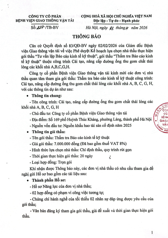 Căn cử Quyết định số 83/QĐ-BV ngày 02/02/2026 của Giám đốc Bệnh viện Giao thông vận tải về việc Phê duyệt Kế hoạch lựa chọn nhà thầu thực hiện gói thầu “Tư vấn lập Báo cáo kinh tế kỹ thuật”, gói thầu “Thẩm tra Báo cáo kinh tế kỹ thuật” thuộc công trình Cải tạo, nâng cấp đường ống thu gom chất thải lỏng các khối nhà A,B,C,G,H.