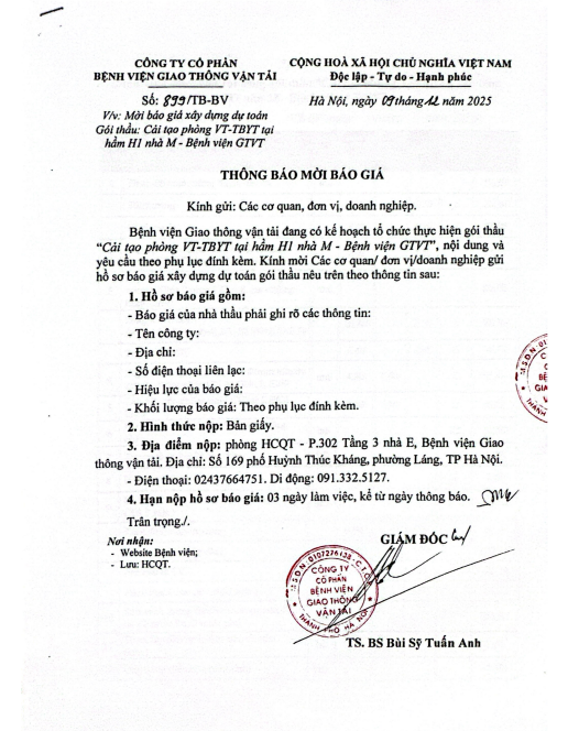 Thông báo mời báo giá "Cải tạo phòng VT-TBYT tại tầng hầm H1 nhà M - Bệnh viện GTVT"15:07 - 10/12/2025Phòng Trang Thiết Bị Vật Tư Y Tế, Yêu cầu báo giá, Đấu thầu, Thông tin chung, Bệnh viện Giao thông vận tải đang có kế hoạch tổ chức thực hiện gói thầu “Cải tạo phòng VT-TBYT tại hầm H1 nhà M - Bệnh viện GTVT” Tải xuống TB mời báo giá dự toán cải tạo phòng VT-TBYT hầm H1.pdfChia sẻ: