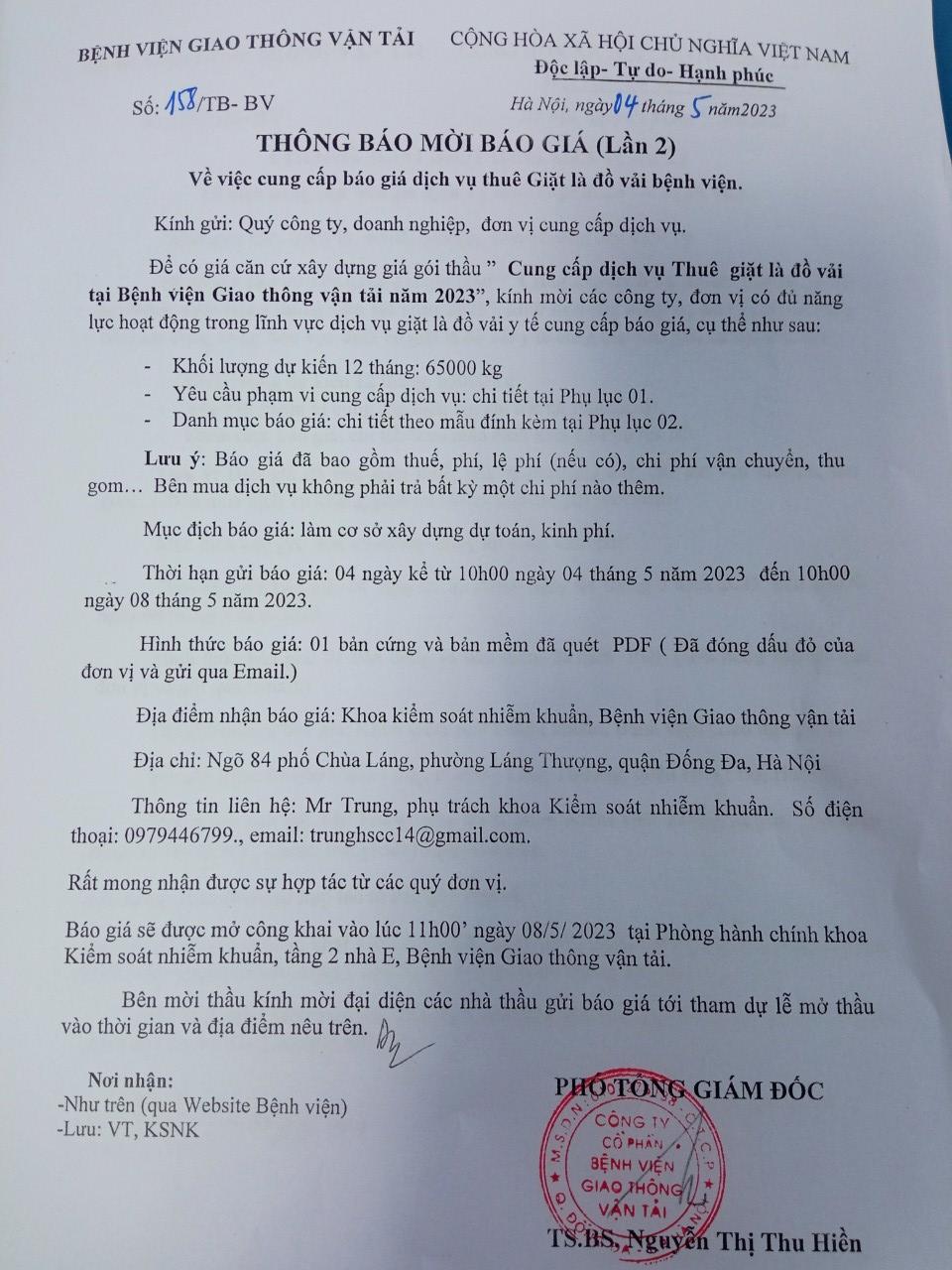THÔNG BÁO MỜI BÁO GIÁ DỊCH VỤ THUÊ GIẶT LÀ ĐỒ VẢI BỆNH VIỆN (LẦN 2)10:15 - 04/05/2023Thông tin, Thông tin chung, Bệnh viện Giao thông vận tải Thông báo mời báo giá: Về việc cung cấp báo giá dịch vụ thuê Giặt là đồ vải bệnh viện.Chia sẻ: