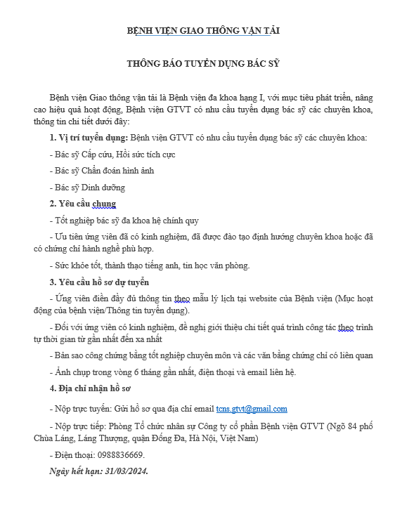 Bệnh viện Giao thông vận tải là Bệnh viện đa khoa hạng I, với mục tiêu phát triển, nâng cao hiệu quả hoạt động, Bệnh viện GTVT có nhu cầu tuyển dụng bác sỹ các chuyên khoa, thông tin chi tiết dưới đây:
