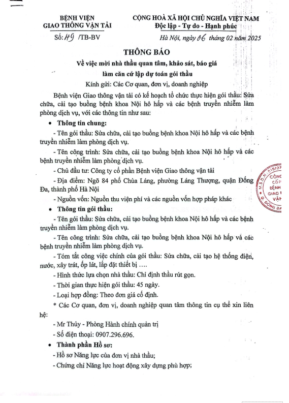 Thông báo về việc mời nhà thầu quan tâm, khảo sát, báo giá làm căn cứ lập dự toán gói thầu16:36 - 06/02/2025Thông tin, Yêu cầu báo giá, Đấu thầu, Thông tin chung, Tải xuống tb mời quan tâm khảo sát báo giá gói sửa.pdfChia sẻ: