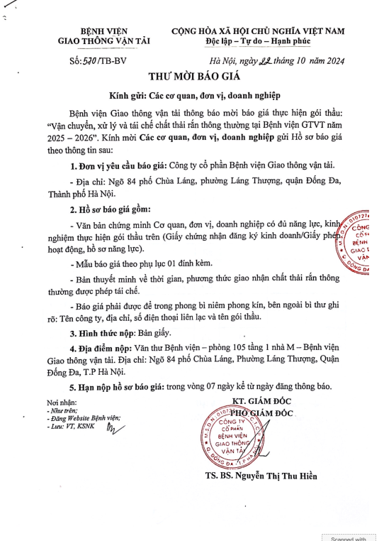 Thư mời báo giá: Vận chuyển, xử lý và tái chế chất thải rắn thông thường tại Bệnh viện GTVT năm 2025-202613:44 - 22/10/2024Thông tin, Yêu cầu báo giá, Đấu thầu, Thông tin chung, Tải xuống thư mời báo giá cttc 2025-2026.pdfChia sẻ: