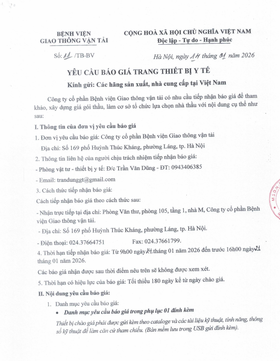 YÊU CẦU BÁO GIÁ TRANG THIẾT BỊ Y TÉ "Máy chạy thận nhân tạo"11:03 - 14/01/2026Thông tin chung, Đấu thầu, Yêu cầu báo giá, Công ty cổ phần Bệnh viện Giao thông vận tải có nhu cầu tiếp nhận báo giá để tham khảo, xây dựng giá gói thầu, làm cơ sở tổ chức lựa chọn nhà thầu. Tải xuống yc bg máy chạy thận nt bvgtvt.pdfChia sẻ: